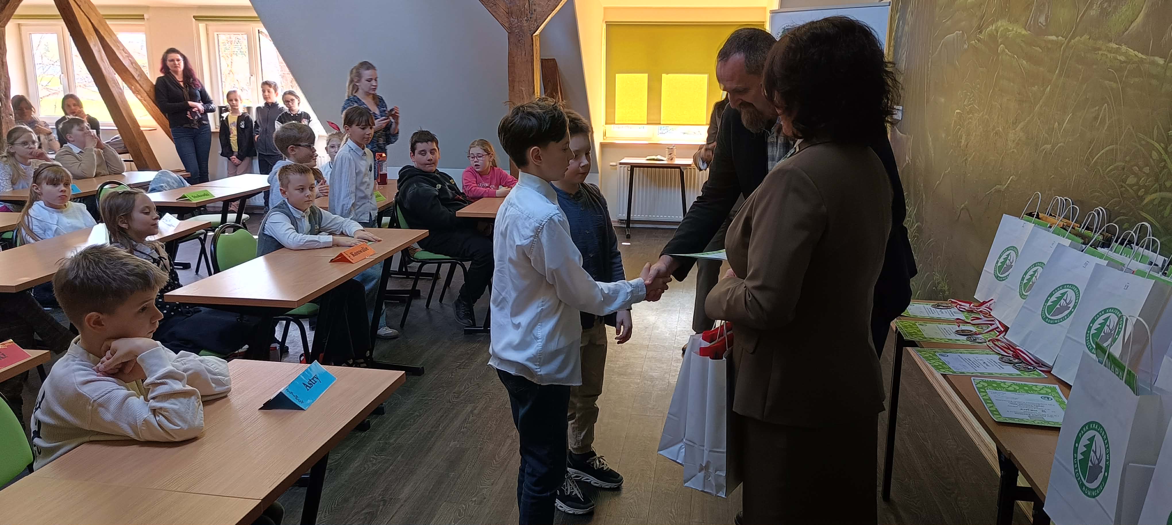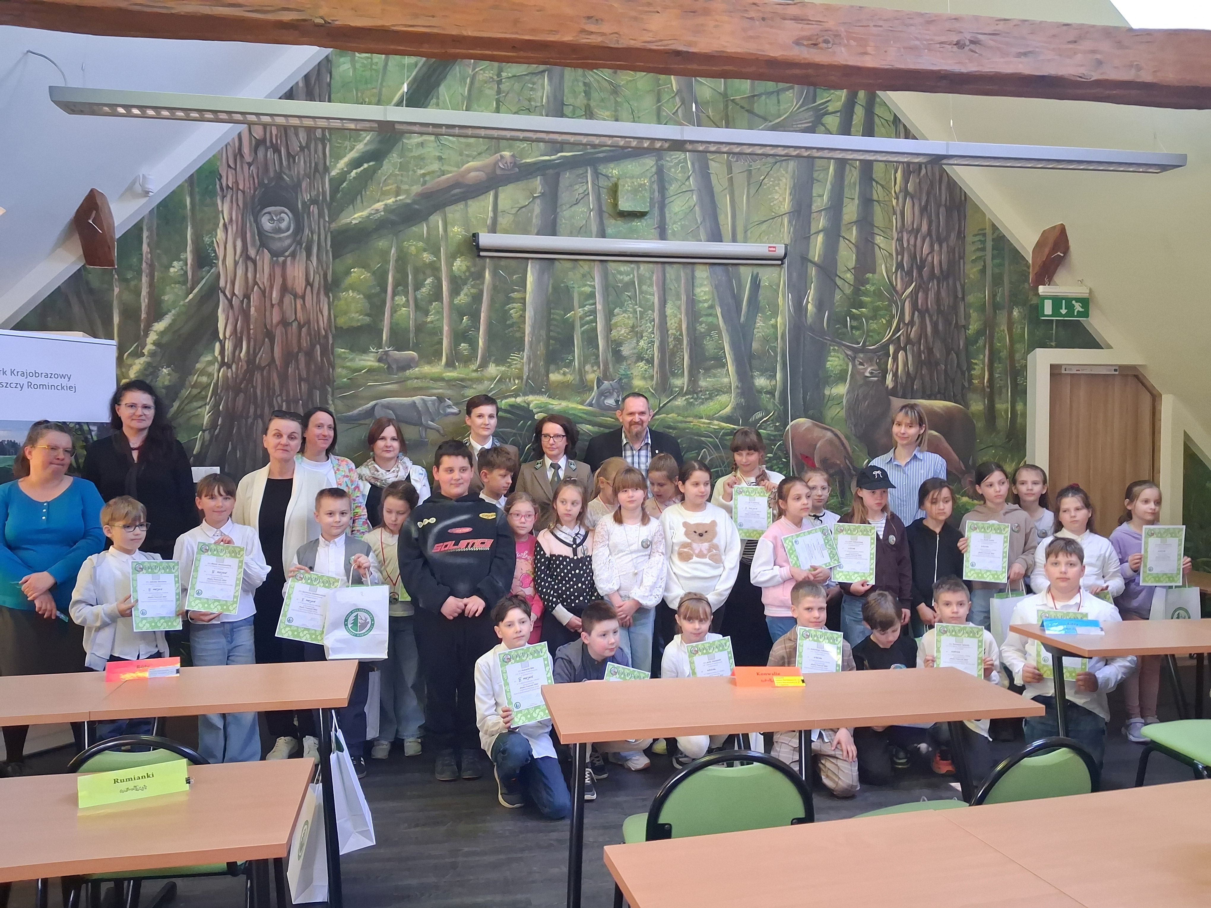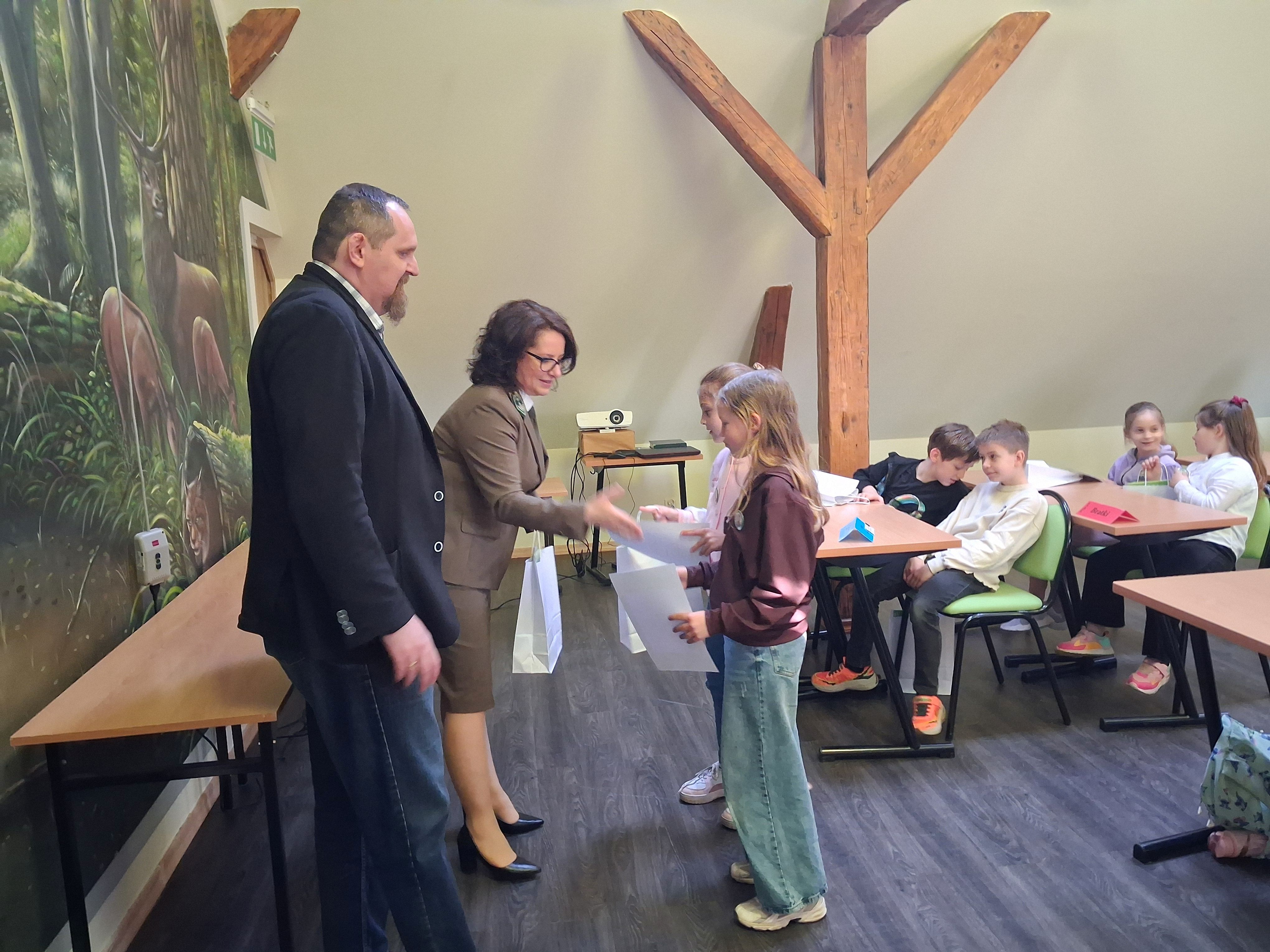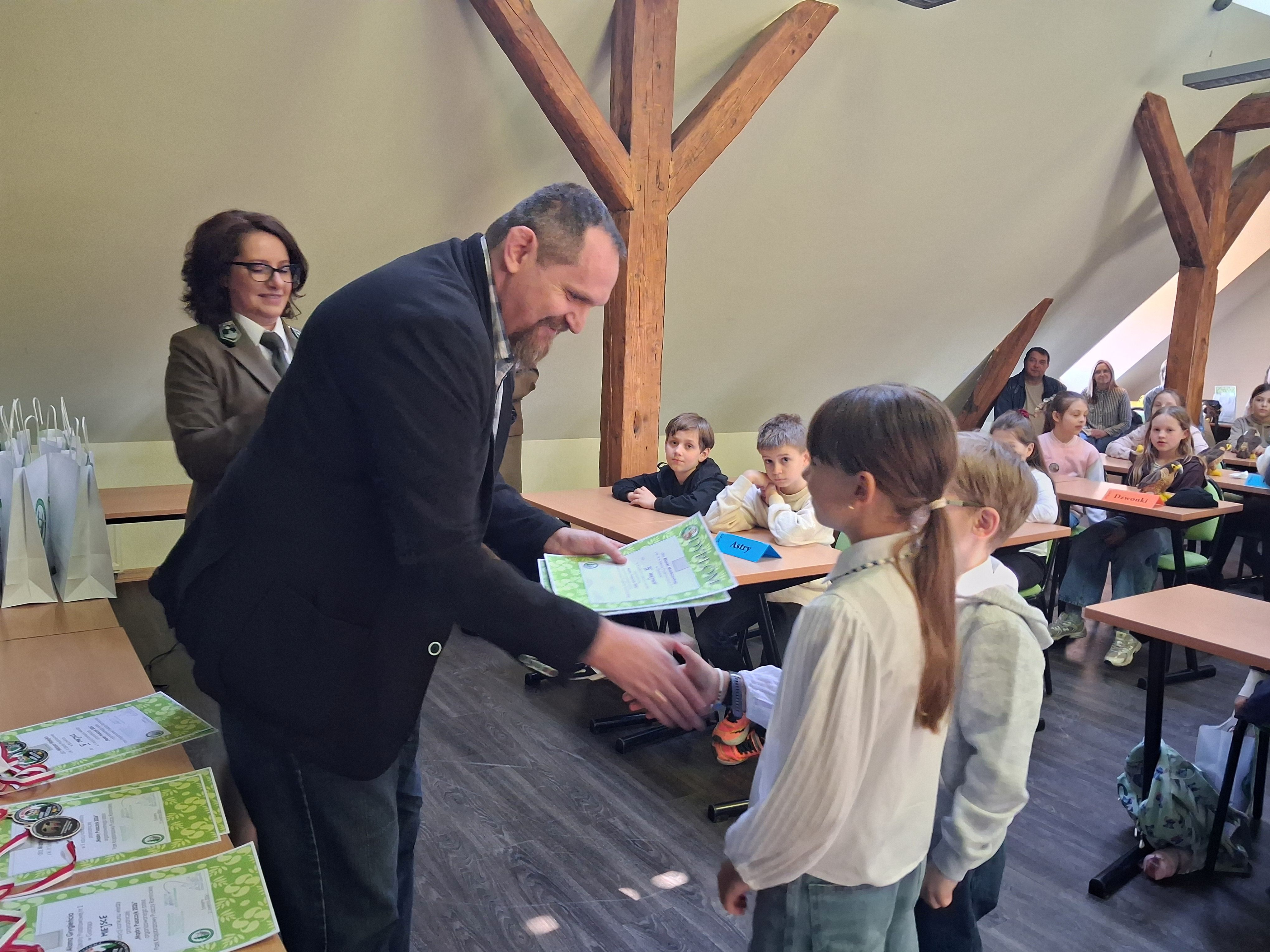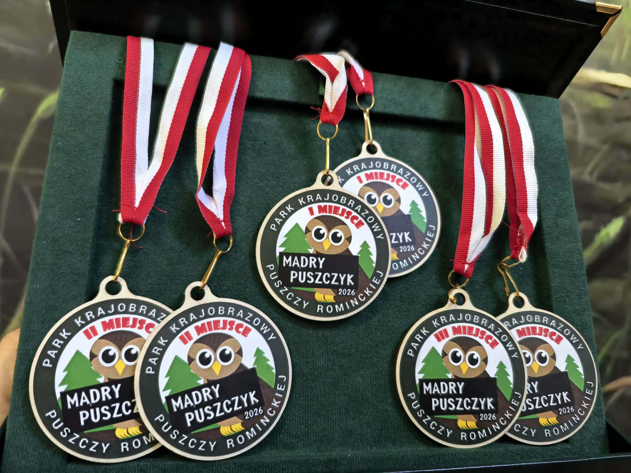 Zdobywcy I, II, III miejsca otrzymali odznaki Mądrego Puszczyka 2026. Nagrody dla laureatów i pozostałych uczestników konkursu oraz upominki dla nauczycieli ufundowało Starostwo Powiatowe w Gołdapi oraz Park Krajobrazowy Puszczy Rominckiej.