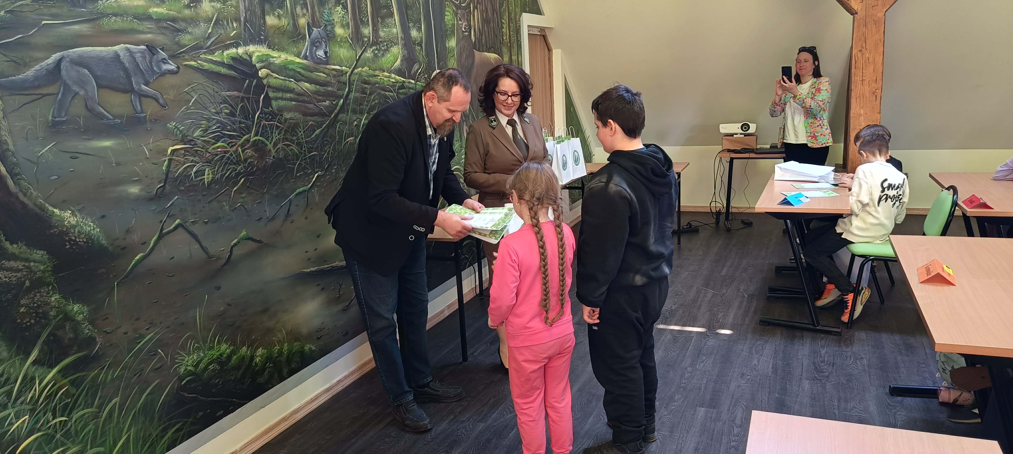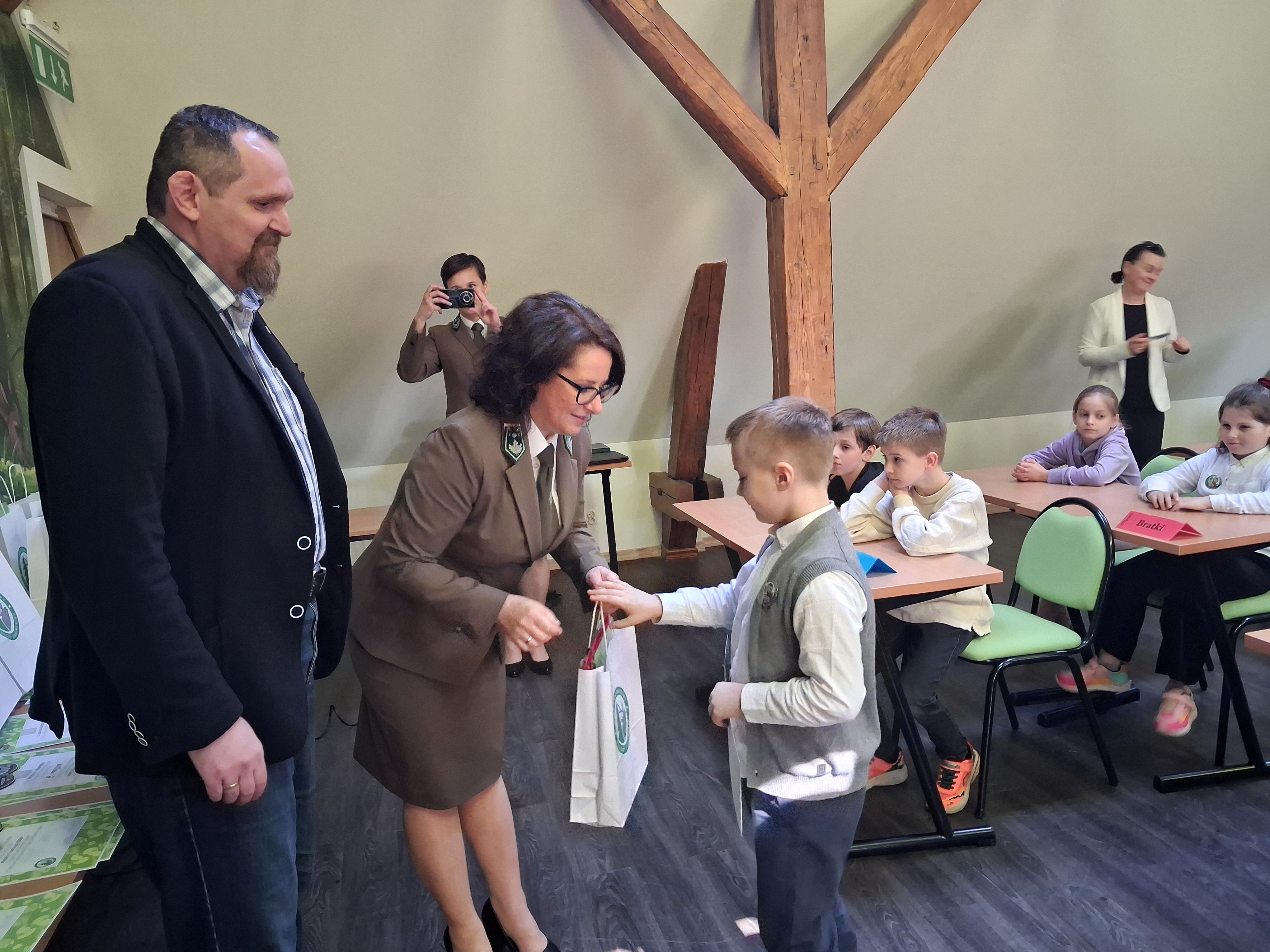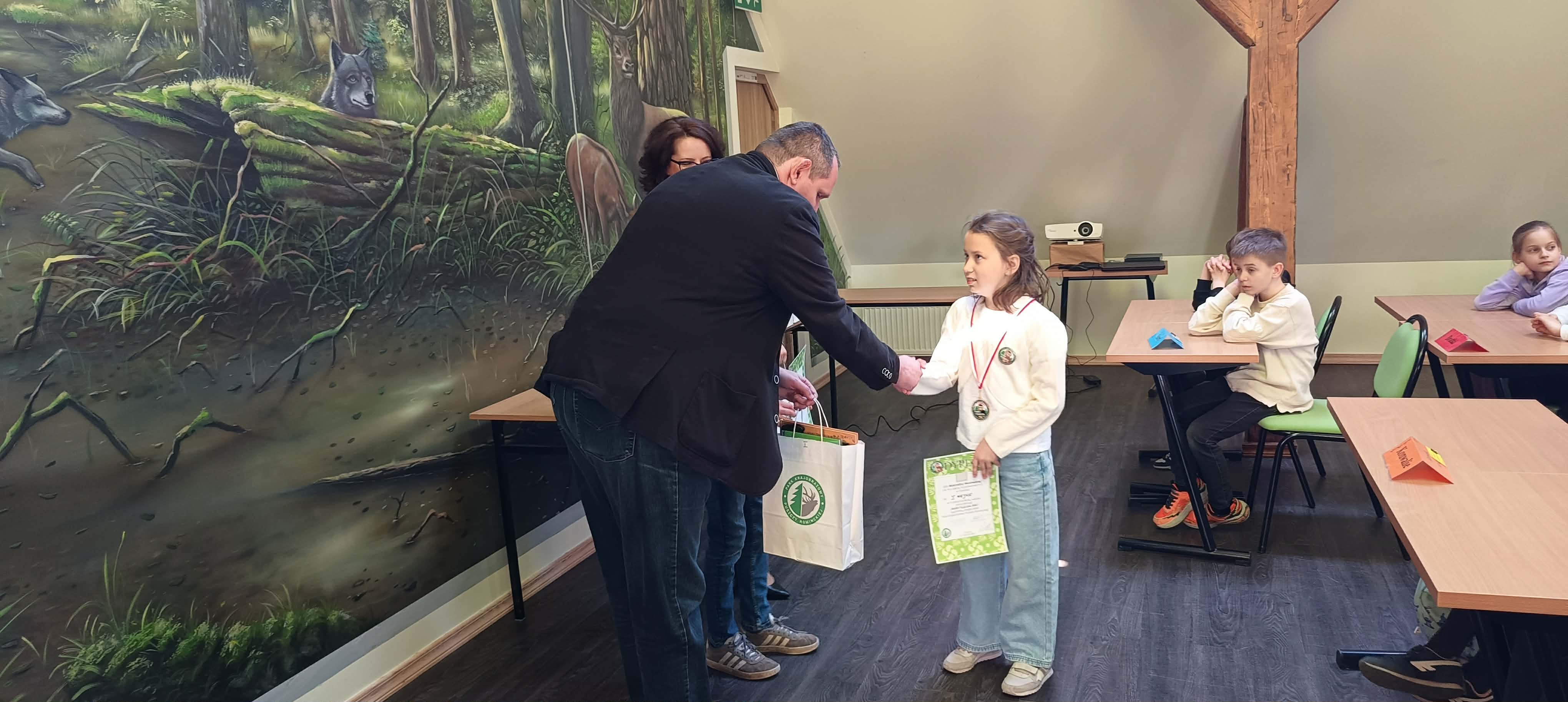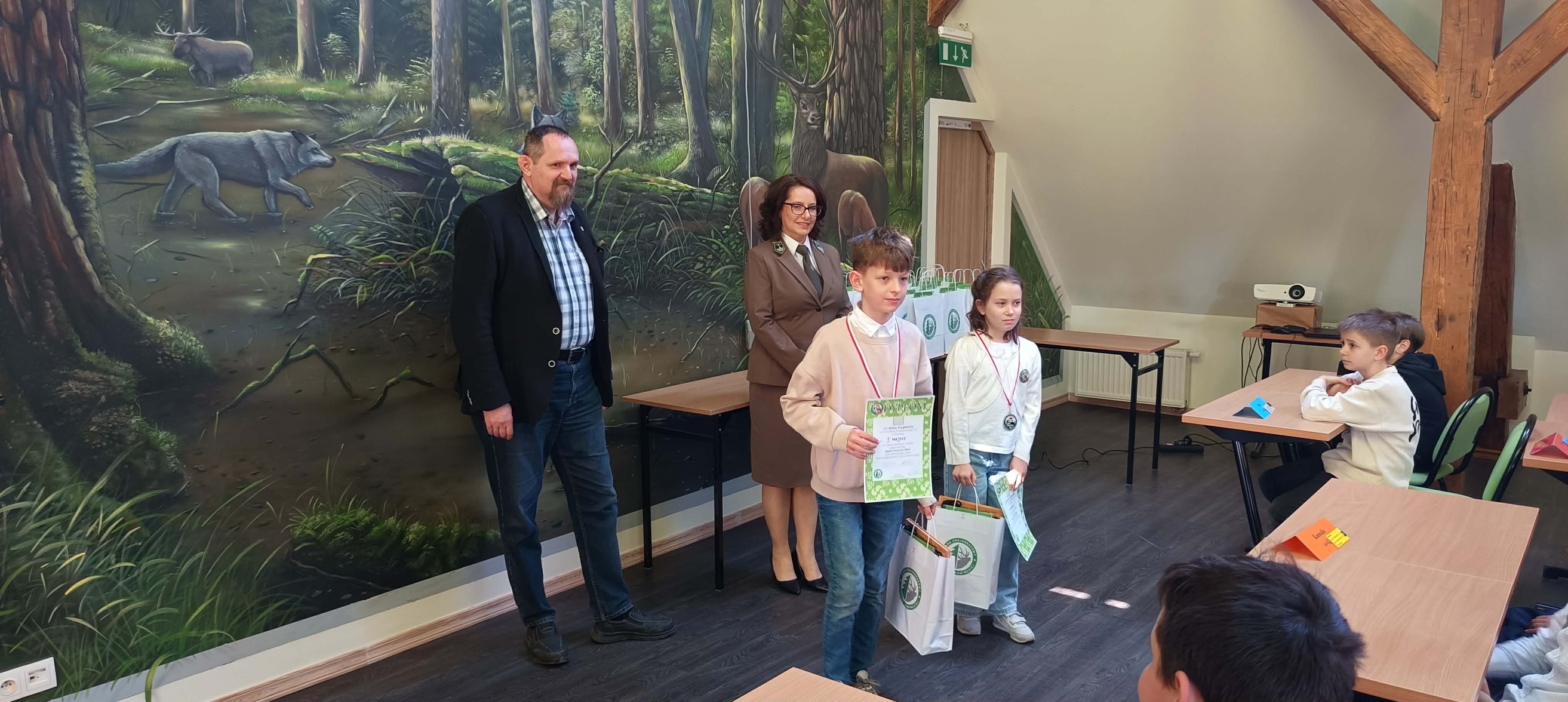 Zdobywcy I, II, III miejsca otrzymali odznaki Mądrego Puszczyka 2026. Nagrody dla laureatów i pozostałych uczestników konkursu oraz upominki dla nauczycieli ufundowało Starostwo Powiatowe w Gołdapi oraz Park Krajobrazowy Puszczy Rominckiej.