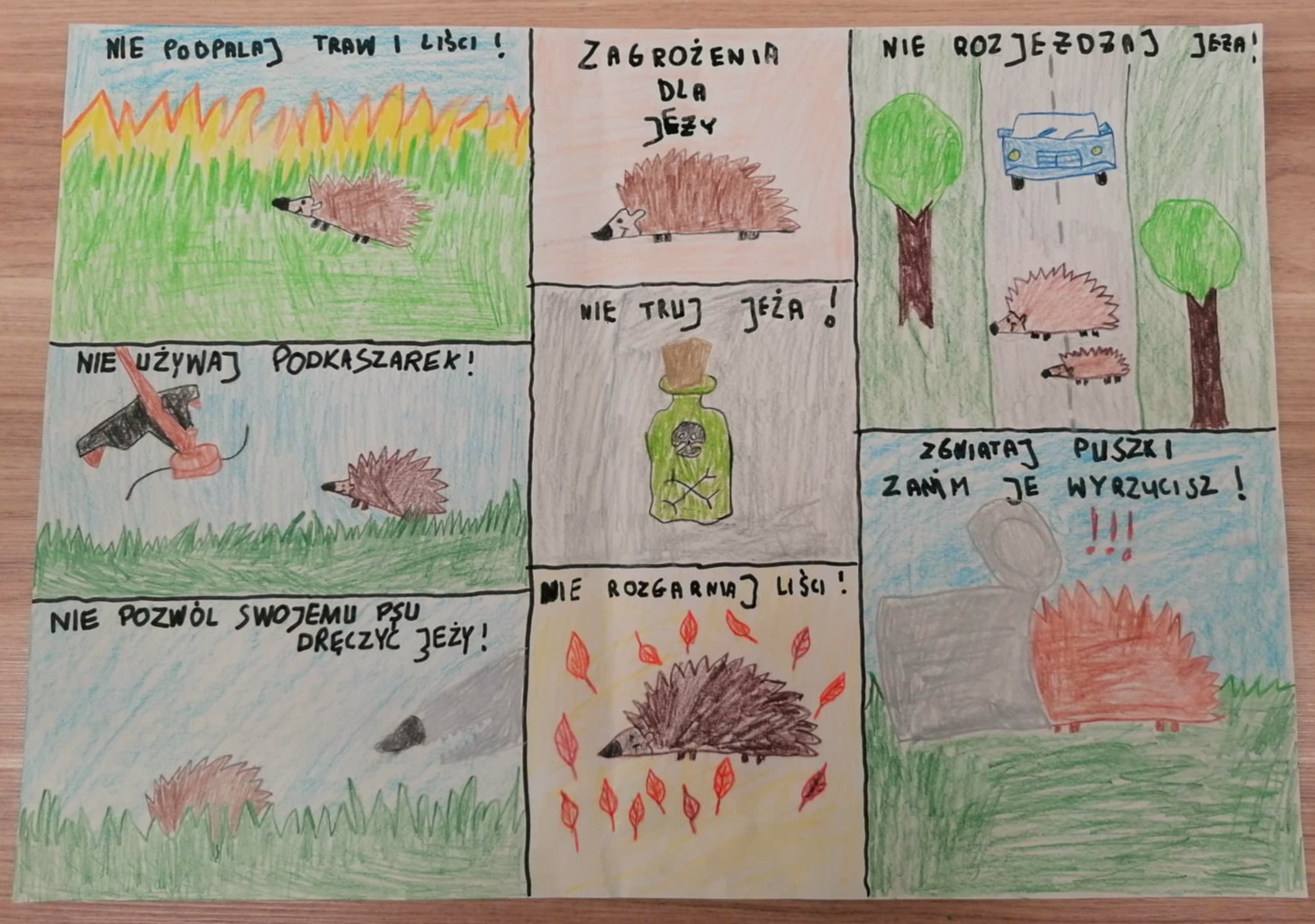 Na konkurs wpłynęło 116 prac wykonanych przez uczniów klas I-III szkół podstawowych z terenu powiatu gołdapskiego. Prace mogły przedstawiać zarówno sposoby ochrony i pomocy jeżom, jak i zagrożenia, na jakie narażone są te małe zwierzęta. Wszystkie prace były przemyślane, zgodne z tematyką konkursu, ciekawie wykonane, przeróżnymi technikami.